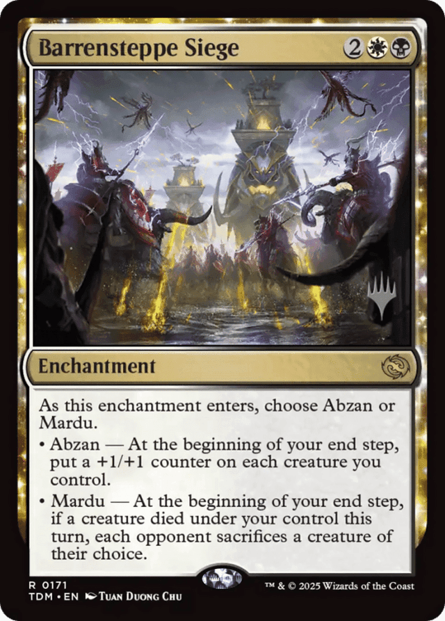 As this enchantment enters, choose Abzan or Mardu. • Abzan — At the beginning of your end step, put a +1/+1 counter on each creature you control. • Mardu — At the beginning of your end step, if a creature died under your control this turn, each opponent sacrifices a creature of their choice.