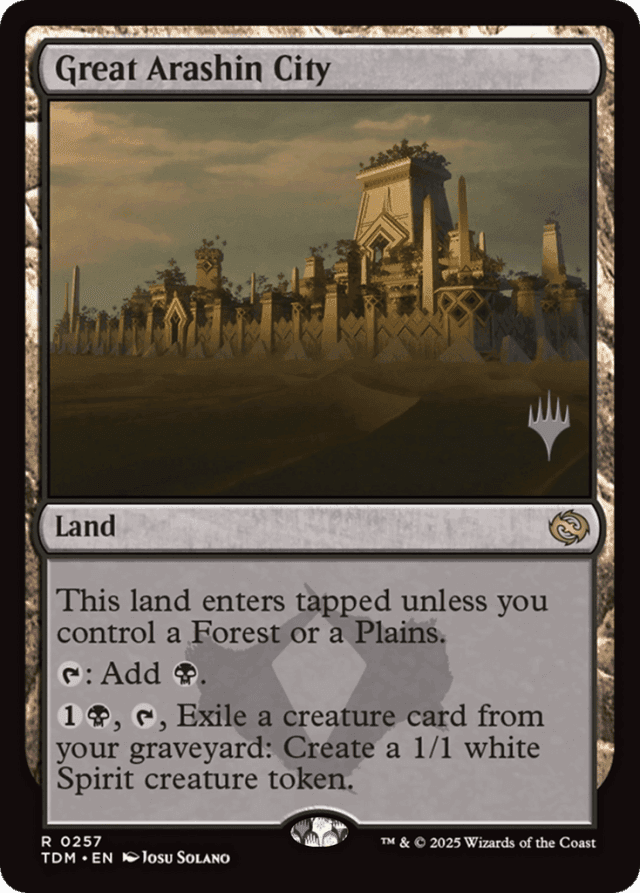 This land enters tapped unless you control a Forest or a Plains. {T}: Add {B}. {1}{B}, {T}, Exile a creature card from your graveyard: Create a 1/1 white Spirit creature token.