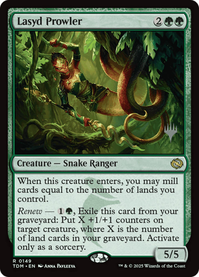 If a card with a renew ability is put into your graveyard during your turn, you can activate that ability if it’s legal to do so before any other player can take any actions. — If you don’t have at least as many cards in your library as lands you control when Lasyd Prowler’s first ability resolves, you can’t choose to mill that many cards. — The value of X is calculated only once, as Lasyd Prowler’s renew ability resolves.