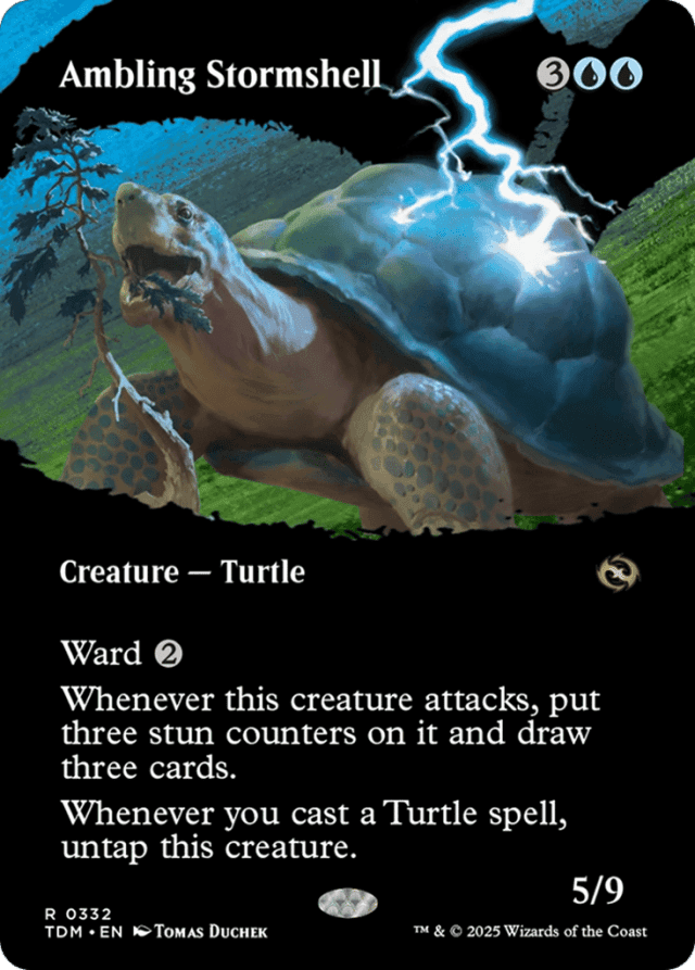 Ward {2} Whenever this creature attacks, put three stun counters on it and draw three cards. (If a permanent with a stun counter would become untapped, remove one from it instead.) Whenever you cast a Turtle spell, untap this creature.