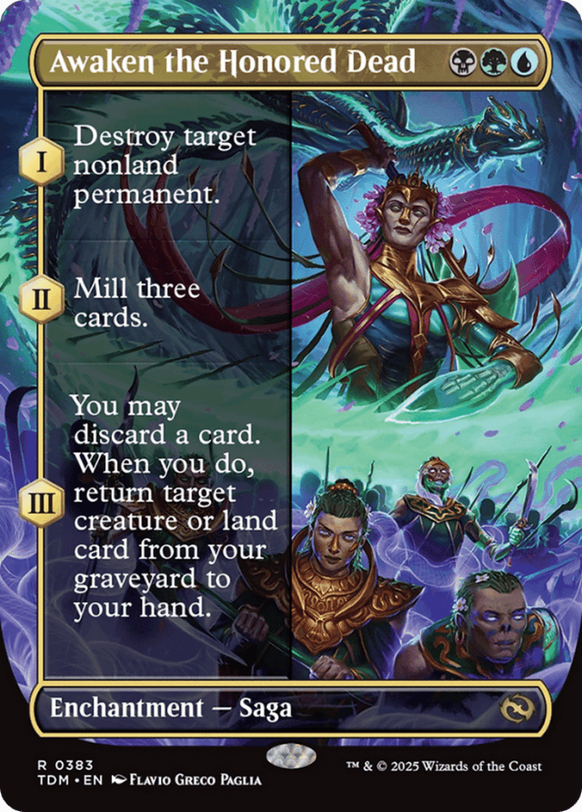 (As this Saga enters and after your draw step, add a lore counter. Sacrifice after III.) I — Destroy target nonland permanent. II — Mill three cards. III — You may discard a card. When you do, return target creature or land card from your graveyard to your hand.