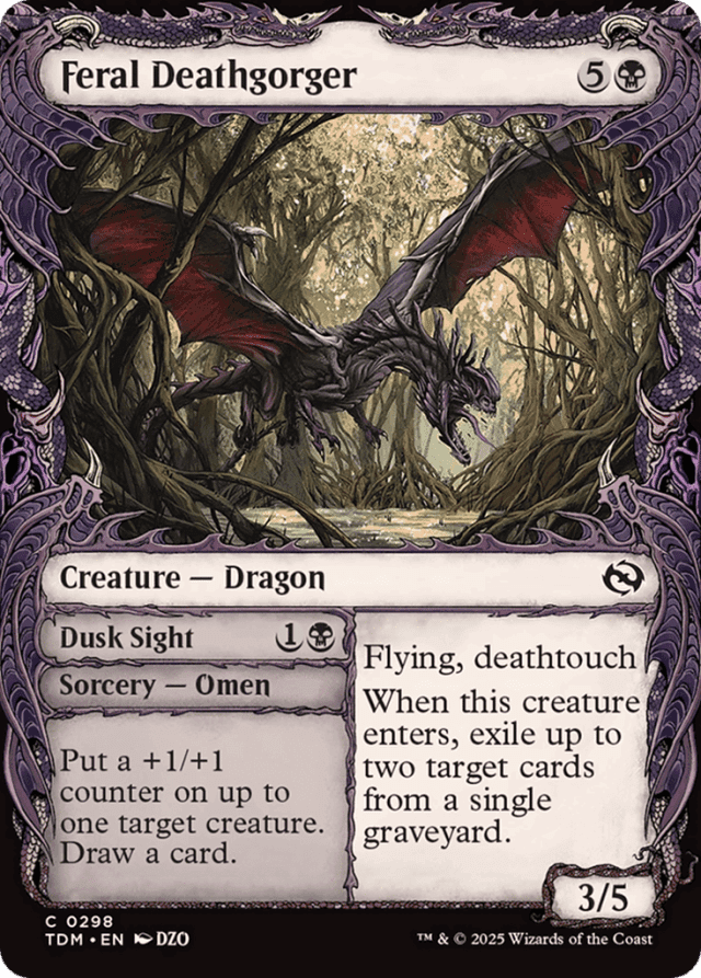 An omen card is a creature card in every zone except the stack, as well as while on the stack if not cast as an Omen. Ignore its alternative characteristics in those cases. For example, while it’s in your graveyard, Twinmaw Stormbrood is a white creature card whose mana value is 6. It can’t be the target of the reflexive ability created by Kishla Trawlers’s triggered ability (“…When you do, return target instant or sorcery card from your graveyard to your hand.”). — As a player casts an omen card, the player chooses whether they cast the card normally or as an Omen. — Casting a card as an Omen isn’t casting it for an alternative cost. Effects that allow you to cast a spell for an alternative cost or without paying its mana cost may allow you to apply those to the Omen. — If a spell is cast as an Omen, its controller shuffles it into its owner’s library instead of putting it into its owner’s graveyard as it resolves. — If an Omen spell has one or more targets and all of those targets are illegal when the spell tries to resolve, it won’t resolve. None of its effects will happen, and it will be put into its owner’s graveyard. It won’t be shuffled into its owner’s library. — If an Omen spell is copied, that copy is also an Omen and is shuffled into its owner’s library as it resolves. Its owner still shuffles their library, but the copy ceases to exist as a state-based action. — If an Omen spell is countered or an effect causes it to otherwise leave the stack, it won’t be shuffled into its owner’s library. — If an effect instructs you to choose a card name, you may choose the alternative Omen name. Consider only the alternative characteristics to determine whether that is an appropriate name to choose. — If you cast an omen card as an Omen, use only its alternative characteristics to determine whether it’s legal to cast that spell. For example, if you control Thundermane Dragon (“You may cast creature spells with power 4 or greater from the top of your library.”) and Twinmaw Stormbrood is on top of your library, you can cast Twinmaw Stormbrood, but not Charring Bite. — When casting a spell as an Omen, use the alternative characteristics and ignore all of the card’s normal characteristics. The spell’s color, mana cost, mana value, and so on are determined by only those alternative characteristics. If the spell leaves the stack, it immediately resumes using its normal characteristics.