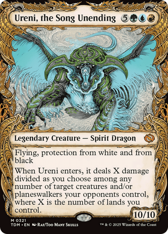 Flying, protection from white and from black When Ureni enters, it deals X damage divided as you choose among any number of target creatures and/or planeswalkers your opponents control, where X is the number of lands you control.