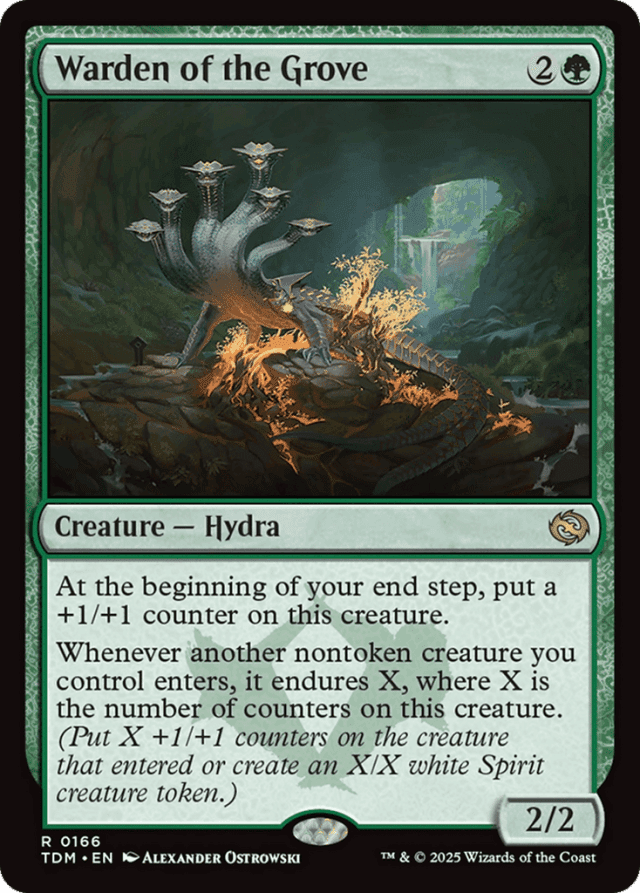 If a noncreature permanent is instructed to endure, the effect is the same. You can put +1/+1 counters on that permanent or create a Spirit token. — If you can’t put +1/+1 counters on the creature for any reason as an endure ability resolves (for example, if the creature is no longer on the battlefield), you’ll just create a Spirit token. — The value of X is determined as the last ability resolves. If Warden of the Grove is no longer on the battlefield at that time, the number of counters on it as it last existed on the battlefield is used to determine how many +1/+1 counters to put on the creature that endured or the power and toughness of the Spirit token created. — You choose whether to put +1/+1 counters on the creature or create a Spirit token as the ability that includes the endure instruction is resolving. No player may take actions between the time you choose and the time that counters are added or tokens are created.
