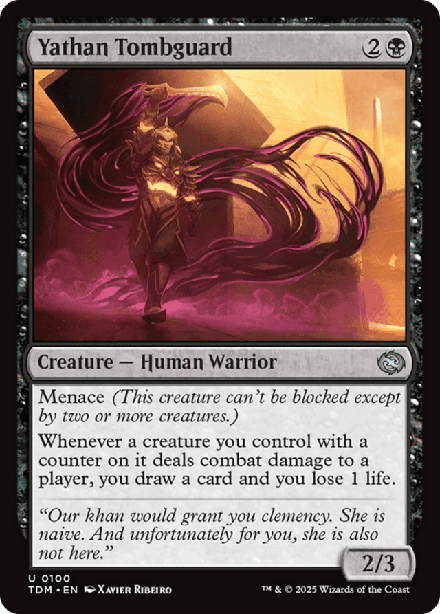Menace (This creature can't be blocked except by two or more creatures.) Whenever a creature you control with a counter on it deals combat damage to a player, you draw a card and you lose 1 life.