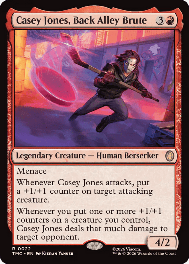 Menace Whenever Casey Jones attacks, put a +1/+1 counter on target attacking creature. Whenever you put one or more +1/+1 counters on a creature you control, Casey Jones deals that much damage to target opponent.