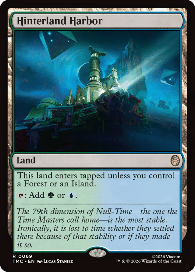 This land enters tapped unless you control a Forest or an Island. {T}: Add {G} or {U}.