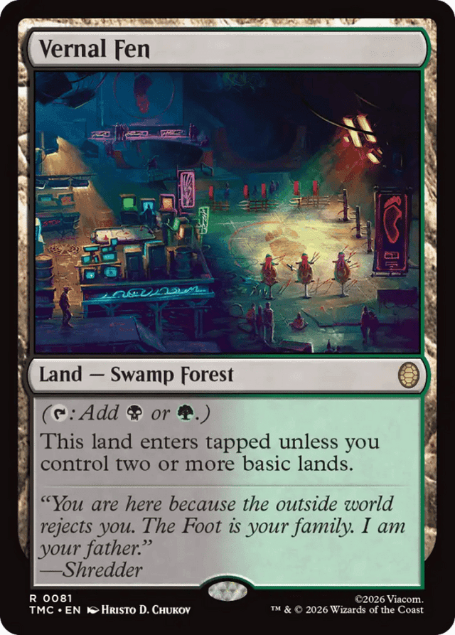 Unlike some other dual lands, Vernal Fen has two basic land types. It’s not basic, so effects that search for basic lands (such as the ability of a Lander token) can’t find it, but it does have the appropriate land types for effects such as that of Wastewood Verge (from the Aetherdrift release).