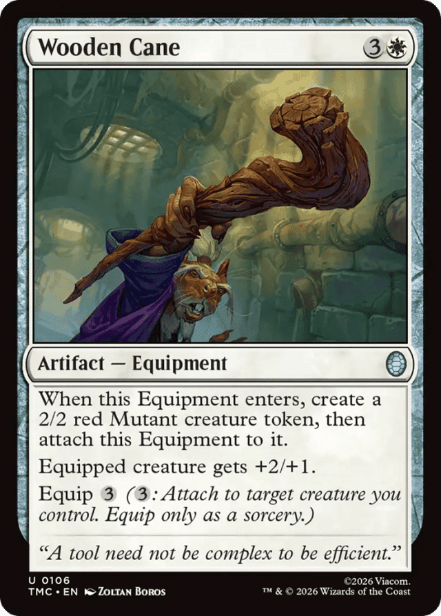 When this Equipment enters, create a 2/2 red Mutant creature token, then attach this Equipment to it. Equipped creature gets +2/+1. Equip {3} ({3}: Attach to target creature you control. Equip only as a sorcery.)