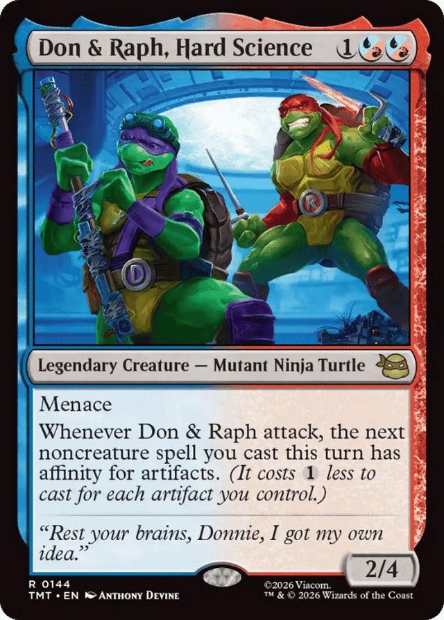 Menace Whenever Don & Raph attack, the next noncreature spell you cast this turn has affinity for artifacts. (It costs {1} less to cast for each artifact you control.)