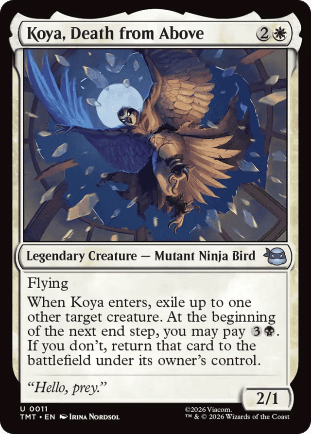 Flying When Koya enters, exile up to one other target creature. At the beginning of the next end step, you may pay {3}{B}. If you don't, return that card to the battlefield under its owner's control.