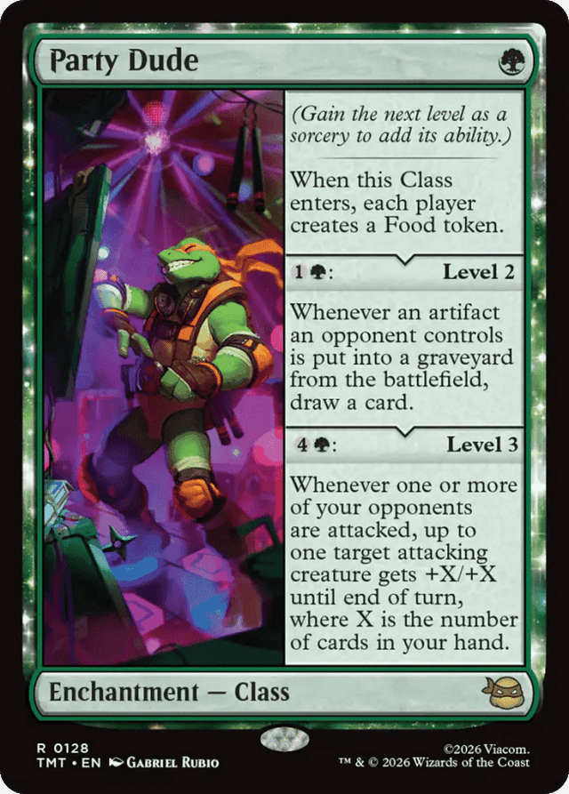 (Gain the next level as a sorcery to add its ability.) When this Class enters, each player creates a Food token. {1}{G}: Level 2 Whenever an artifact an opponent controls is put into a graveyard from the battlefield, draw a card. {4}{G}: Level 3 Whenever one or more of your opponents are attacked, up to one target attacking creature gets +X/+X until end of turn, where X is the number of cards in your hand.