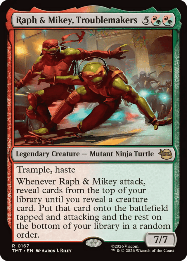 Trample, haste Whenever Raph & Mikey attack, reveal cards from the top of your library until you reveal a creature card. Put that card onto the battlefield tapped and attacking and the rest on the bottom of your library in a random order.
