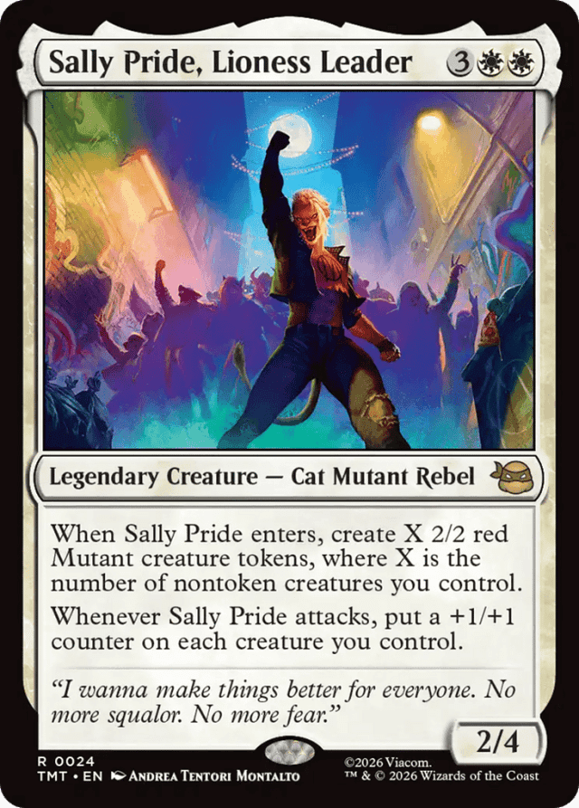 When Sally Pride enters, create X 2/2 red Mutant creature tokens, where X is the number of nontoken creatures you control. Whenever Sally Pride attacks, put a +1/+1 counter on each creature you control.