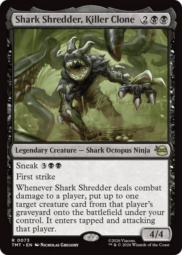 Sneak {3}{B}{B} First strike Whenever Shark Shredder deals combat damage to a player, put up to one target creature card from that player's graveyard onto the battlefield under your control. It enters tapped and attacking that player.