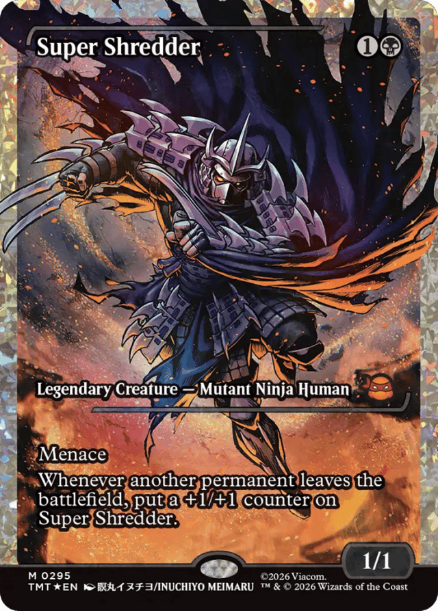 Menace Whenever another permanent leaves the battlefield, put a +1/+1 counter on Super Shredder.