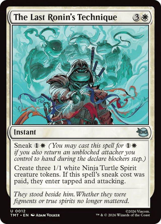 Sneak {1}{W} (You may cast this spell for {1}{W} if you also return an unblocked attacker you control to hand during the declare blockers step.) Create three 1/1 white Ninja Turtle Spirit creature tokens. If this spell's sneak cost was paid, they enter tapped and attacking.