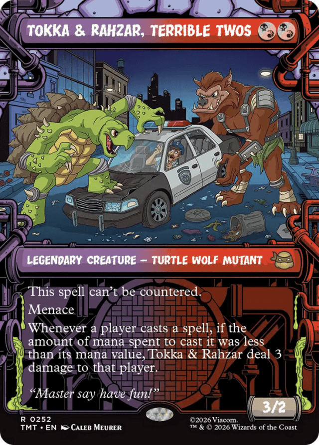 This spell can't be countered. Menace Whenever a player casts a spell, if the amount of mana spent to cast it was less than its mana value, Tokka & Rahzar deal 3 damage to that player.