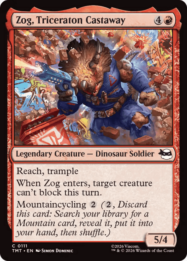 Reach, trample When Zog enters, target creature can't block this turn. Mountaincycling {2} ({2}, Discard this card: Search your library for a Mountain card, reveal it, put it into your hand, then shuffle.)