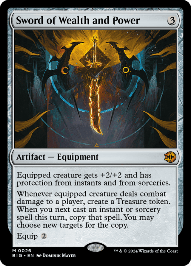 If the copied spell divides damage or distributes counters among a number of targets, the division and number of targets can’t be changed. If you choose new targets, you must choose the same number of targets. — If the spell that’s copied has an X whose value was determined as it was cast, the copy will have the same value of X. — If the spell that’s copied is modal (that is, it says “Choose one —” or the like), the copy will have the same mode or modes. You can’t choose different ones. — Protection from instants and from sorceries means that the equipped creature can’t be the target of instant spells, sorcery spells, or abilities from instant or sorcery cards (such as an ability of an instant card that triggers when that card is cycled), and all damage that an instant or sorcery spell or card would deal to it is prevented. Nothing other than these events is prevented or illegal. — The copy created by Sword of Wealth and Power’s delayed triggered ability will have the same targets as the spell it’s copying unless you choose new ones. You may change any number of the targets, including all of them or none of them. The new targets must be legal. — The copy made by Sword of Wealth and Power’s delayed triggered ability is created on the stack, so it’s not “cast.” — You can’t choose to pay any additional costs for the copy. However, effects based on any additional costs that were paid for the original spell are copied as though those same costs were paid for the copy too.