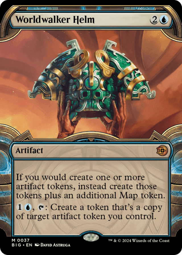 Any enters-the-battlefield abilities of the copied token will trigger when the token enters the battlefield. Any "as [this permanent] enters the battlefield" or "[this permanent] enters the battlefield with" abilities of the copied token will also work. — If the copied token has {X} in its mana cost, X is 0. (Most tokens don't have a mana cost unless they're copying something else.) — If the copied token is copying something else, then the new token enters the battlefield as whatever that token copied. — The additional Map token won't have any abilities the other tokens were created with. Anything else specified in the effect creating the token (such as tapped or "Exile that token at end of combat") applies to both the original tokens and the Map. — The new token created by Worldwaker Helm's last ability copies the original characteristics of the target token as stated by the effect that created the target token and nothing else (unless that token is copying something else; see below). It doesn't copy whether the target token is tapped or untapped, whether it has any counters on it or Auras and Equipment attached to it, or any non-copy effects that have changed its power, toughness, types, color, and so on. — Worldwaker Helm's first ability applies to all kinds of artifact tokens that its controller creates, not just Map tokens. — You don't need to control the spell or ability that creates the tokens, but you do have to be the one creating the tokens for Worldwaker Helm's first ability to apply.