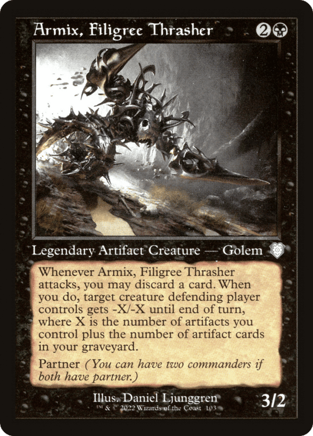 Whenever Armix attacks, you may discard a card. When you do, target creature defending player controls gets -X/-X until end of turn, where X is the number of artifacts you control plus the number of artifact cards in your graveyard. Partner (You can have two commanders if both have partner.)