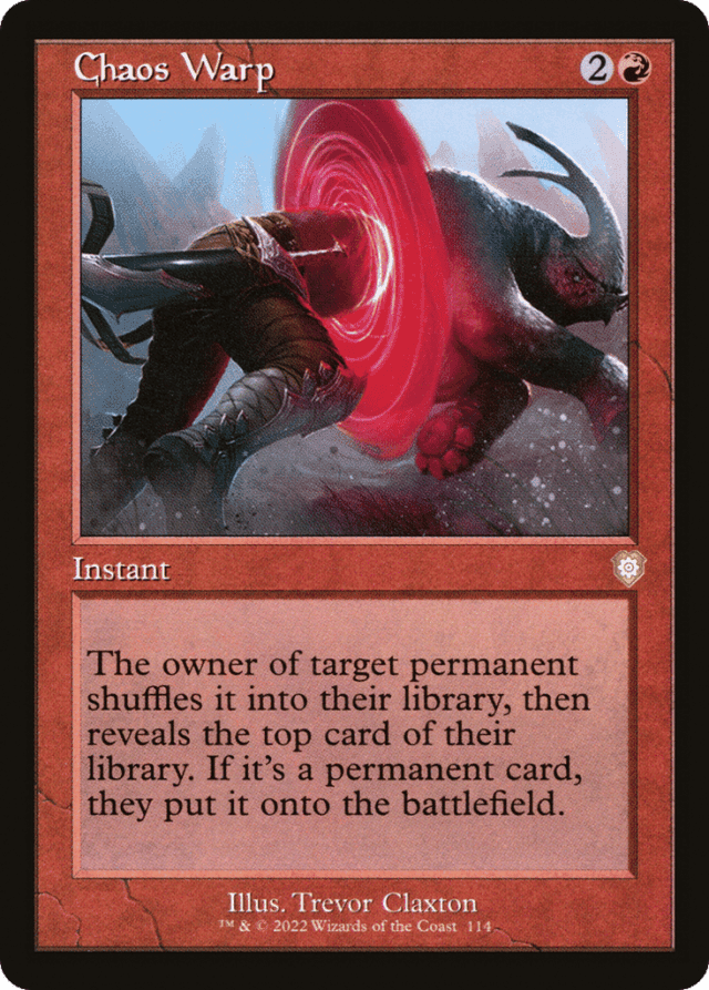 A permanent card is a card with one or more of the following card types: artifact, creature, enchantment, land, or planeswalker. — If the permanent is an illegal target by the time Chaos Warp tries to resolve, it won't resolve and none of its effects will occur. No library will be shuffled and no card will be revealed. — If the revealed card is a permanent card but can't enter (perhaps because it's an Aura with nothing to enchant), it remains on top of that library. — If the revealed card is not a permanent card, it remains on top of that library. — The owner of a token is the player under whose control the token was put onto the battlefield. If a token is shuffled into a player's library this way, that player shuffles before revealing the top card of that library.