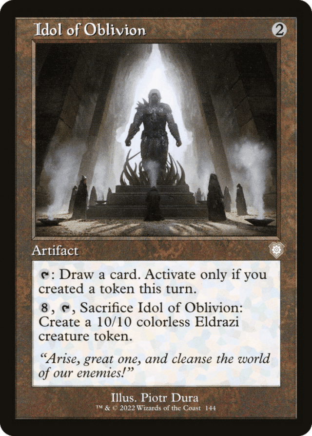 {T}: Draw a card. Activate only if you created a token this turn. {8}, {T}, Sacrifice this artifact: Create a 10/10 colorless Eldrazi creature token.
