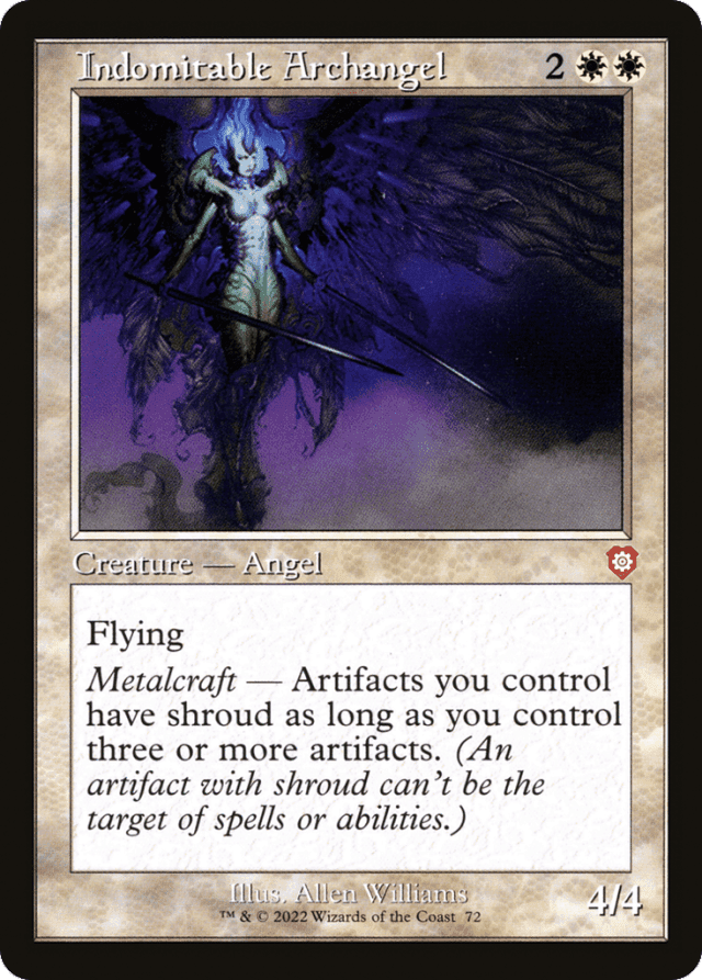 Flying Metalcraft — Artifacts you control have shroud as long as you control three or more artifacts. (An artifact with shroud can't be the target of spells or abilities.)