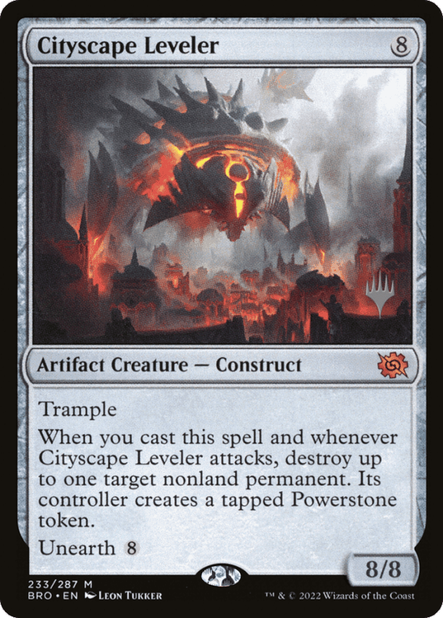 Activating a card's unearth ability isn't the same as casting that card. The unearth ability is put on the stack, but the card is not. Spells and abilities that interact with activated abilities (such as Defabricate's second mode) will interact with unearth, but spells and abilities that interact with spells (such as Scatter Ray) will not. — Although all the cards in The Brothers' War that create Powerstone tokens create a tapped Powerstone token, entering the battlefield tapped isn't part of the token's definition. Notably, if you create a token that is a copy of a Powerstone token, the token copy won't enter the battlefield tapped. — At the beginning of the next end step, a permanent returned to the battlefield with unearth is exiled. This is a delayed triggered ability, and it can be countered by effects such as Defabricate that counter triggered abilities. If the ability is countered, the permanent will stay on the battlefield and the delayed triggered ability won't trigger again. However, the replacement effect will still exile the permanent if it eventually leaves the battlefield. — Cityscape Leveler's triggered ability won't trigger when you activate its unearth ability from your graveyard. It will, however, trigger when you attack with Cityscape Leveler that turn. — If a permanent returned to the battlefield with unearth would leave the battlefield for any reason, it's exiled instead—unless the spell or ability that's causing the permanent to leave the battlefield is actually trying to exile it! In that case, it succeeds at exiling it. If that spell or ability later returns the card to the battlefield (as Static Net might, for example), the permanent card will return to the battlefield as a new object with no relation to its previous existence. The unearth effects will no longer apply to it. — If you activate a card's unearth ability but that card is removed from your graveyard before the ability resolves, that unearth ability will do nothing as it resolves. — Powerstone tokens are a kind of predefined token. Each one has the artifact subtype "Powerstone" and the ability "{T}: Add {C}. This mana can't be spent to cast a nonartifact spell." — Unearth grants haste to the permanent that's returned to the battlefield (even if it's not a creature card). However, neither of the "exile" abilities is granted to that permanent. If that permanent loses all its abilities, it will still be exiled at the beginning of the next end step, and if it would leave the battlefield, it is still exiled instead. — You can use the {C} added by a Powerstone token on anything that isn't a nonartifact spell. This includes paying costs to activate abilities of both artifact and nonartifact permanents, paying ward costs, and so on.