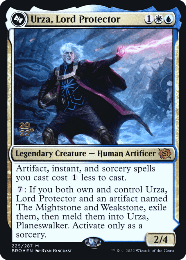 Artifact, instant, and sorcery spells you cast cost {1} less to cast. {7}: If you both own and control Urza, Lord Protector and an artifact named The Mightstone and Weakstone, exile them, then meld them into Urza, Planeswalker. Activate only as a sorcery.