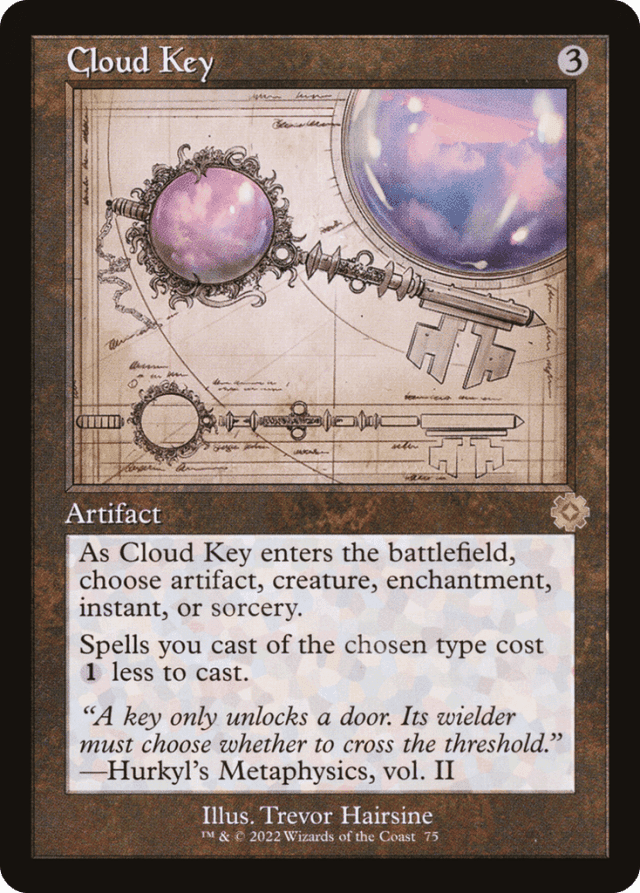 The cost reduction applies only to generic mana in the cost of spells of the chosen type you cast. — To determine the total cost of a spell, start with the mana cost or alternative cost you're paying (such as a flashback cost), add any cost increases (such as kicker costs), then apply any cost reductions (such as that of Cloud Key's ability). The mana value of the spell is determined by only its mana cost, no matter what the total cost to cast that spell was.