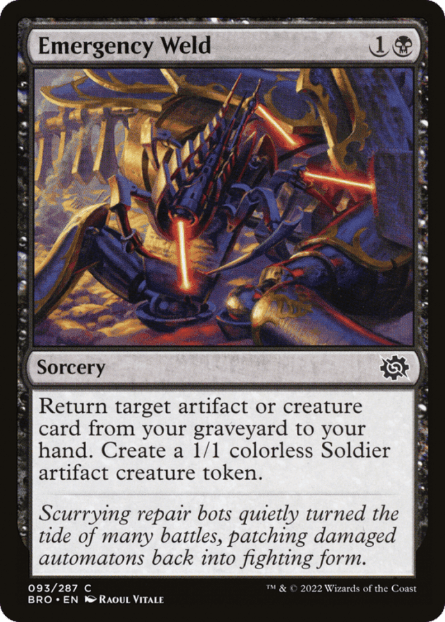 If the card in your graveyard is an illegal target as Emergency Weld tries to resolve, Emergency Weld is removed from the stack and you won't create a token. — You can't cast Emergency Weld without an artifact or creature card in your graveyard to target.