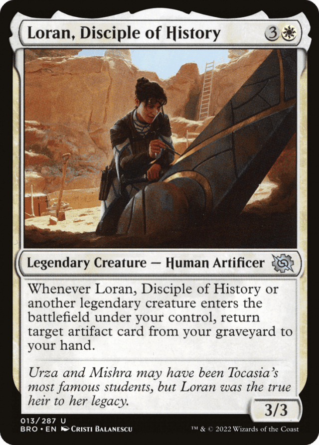 Whenever Loran or another legendary creature you control enters, return target artifact card from your graveyard to your hand.