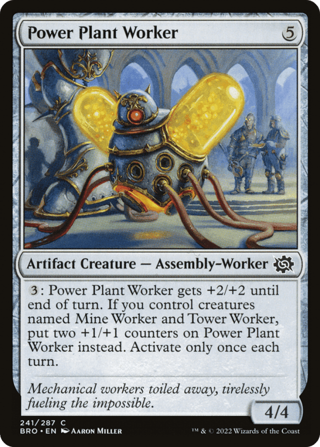 {3}: This creature gets +2/+2 until end of turn. If you control creatures named Mine Worker and Tower Worker, put two +1/+1 counters on this creature instead. Activate only once each turn.