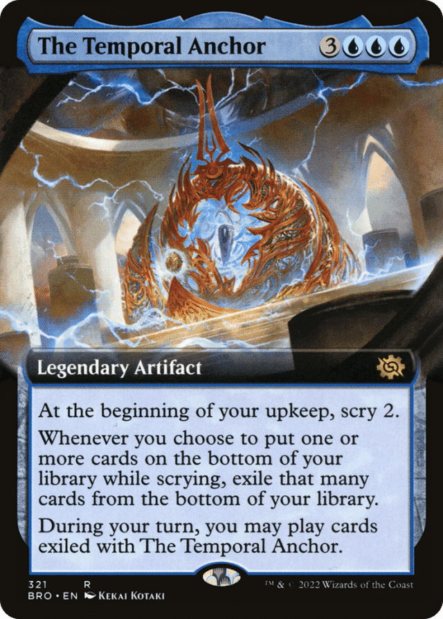 At the beginning of your upkeep, scry 2. Whenever you choose to put one or more cards on the bottom of your library while scrying, exile that many cards from the bottom of your library. During your turn, you may play cards exiled with The Temporal Anchor.