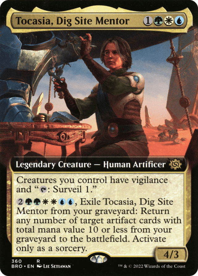 Creatures you control have vigilance and "{T}: Surveil 1." (To surveil 1, look at the top card of your library. You may put that card into your graveyard.) {2}{G}{G}{W}{W}{U}{U}, Exile this card from your graveyard: Return any number of target artifact cards with total mana value 10 or less from your graveyard to the battlefield. Activate only as a sorcery.