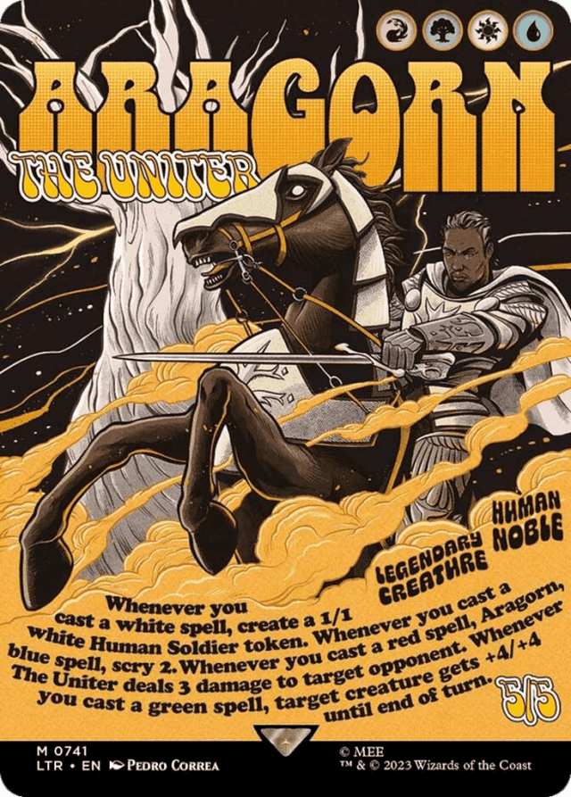 Whenever you cast a white spell, create a 1/1 white Human Soldier creature token. Whenever you cast a blue spell, scry 2. Whenever you cast a red spell, Aragorn deals 3 damage to target opponent. Whenever you cast a green spell, target creature gets +4/+4 until end of turn.