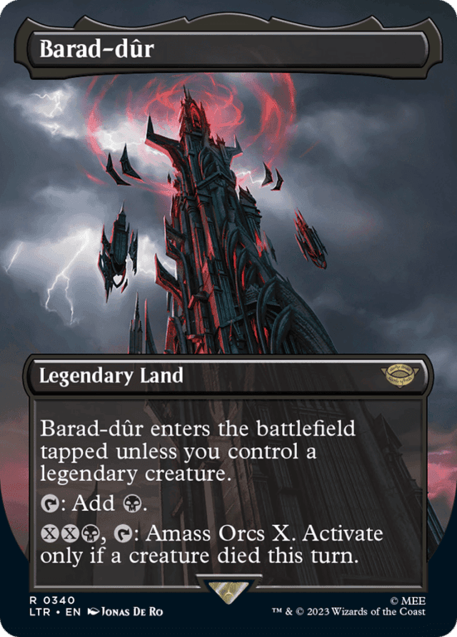 Barad-dûr enters tapped unless you control a legendary creature. {T}: Add {B}. {X}{X}{B}, {T}: Amass Orcs X. Activate only if a creature died this turn.