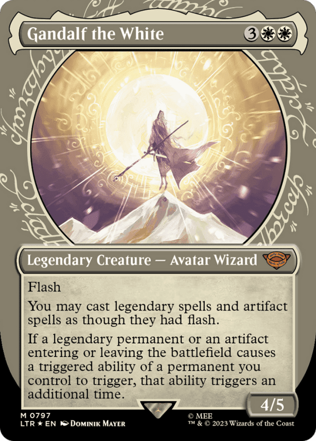 Abilities that apply "as [this permanent] enters the battlefield," such as choosing a color with Gauntlet of Power, are also unaffected. — An ability of a permanent that triggers when a card is put into a graveyard "from anywhere" triggers twice only if Gandalf the White and that permanent are both still on the battlefield immediately after the legendary permanent or the artifact has been put into the graveyard from the battlefield. For example, say you control both Gandalf the White and Soulcipher Board. If another legendary creature you control dies, Soulcipher Board's last ability will trigger twice. But if Gandalf the White dies, Soulcipher Board's last ability will trigger only once. — Gandalf the White affects a permanent's own enters-the-battlefield and leaves-the-battlefield triggered abilities as well as other triggered abilities that trigger when that permanent enters or leaves the battlefield. Such triggered abilities start with "when" or "whenever." — Gandalf the White's effect doesn't copy the triggered ability; it just causes the ability to trigger twice. Any choices made as you put the ability onto the stack, such as modes and targets, are made separately for each instance of the ability. Any choices made on resolution, such as whether to put counters on a permanent, are also made individually. — If a legendary permanent or an artifact entering or leaving the battlefield at the same time as Gandalf the White (including Gandalf the White itself) causes a triggered ability of a permanent you control to trigger, that ability triggers an additional time. — If you somehow control two copies of Gandalf the White, a legendary permanent or an artifact entering or leaving the battlefield causes abilities to trigger three times, not four. A third Gandalf the White causes abilities to trigger four times, a fourth causes abilities to trigger five times, and so on. — Look at each legendary permanent and each artifact as it exists on the battlefield, taking into account continuous effects, to determine whether any triggered abilities will trigger multiple times. For example, if a nonlegendary creature that has become legendary (probably because it's a player's Ring-bearer) dies, an ability that triggers when it leaves the battlefield triggers twice. — Replacement effects are unaffected by Gandalf the White's ability. For example, a legendary creature that enters the battlefield with one +1/+1 counter on it won't receive an additional +1/+1 counter. — The second ability applies only to casting spells. It does not, for example, change when you may activate abilities that can be activated "only as a sorcery." — The trigger event doesn't have to specifically refer to legendary permanents or to artifacts, nor does it have to specifically refer to when something "leaves the battlefield." For example, an ability that triggers "whenever a creature dies" would trigger twice if a legendary creature or an artifact creature dies while Gandalf the White is on the battlefield, as would an ability that triggers "whenever a permanent is put into a graveyard from the battlefield." — You don't need to control the permanent entering or leaving the battlefield, only the permanent that has the triggered ability.