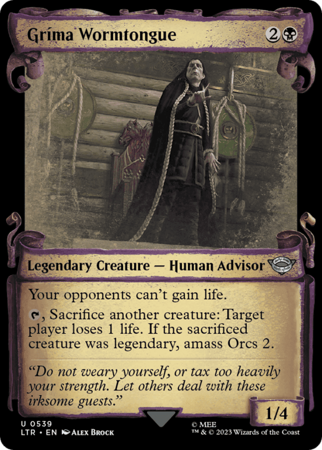 Amass Zombies works the same way, except you create a 0/0 black Zombie Army creature token if you don't control an Army. If the Army creature you chose isn't already a Zombie, it becomes a Zombie in addition to its other types. By combining cards with amass Orcs and amass Zombies, you can end up with an Orc Zombie Army. — Amass abilities are now written as "amass [subtype] N." Previous cards with amass have received errata to say "amass Zombies N." — Gríma Wormtongue's activated ability checks whether the sacrificed creature was legendary as it last existed on the battlefield. It doesn't matter whether or not it's legendary in the graveyard. — If an effect says to set an opponent's life total to a number that's higher than the opponent's current life total while Gríma Wormtongue is on the battlefield, the player's life total doesn't change. — If you don't control an Army, the Orc Army token you create enters the battlefield as a 0/0 creature before receiving counters. Any abilities that trigger when a creature with a certain power enters the battlefield, such as that of Mentor of the Meek, will see the token enter as a 0/0 creature before it gets +1/+1 counters. — In the rare case that you control multiple Army creatures (perhaps because you played a creature with changeling) while you amass Orcs, you choose which of your Army creatures to put the +1/+1 counters on. If that creature isn't an Orc, it becomes an Orc in addition to its other types. — Some cards refer to the "amassed Army." That means the Army creature you chose to receive counters, even if no counters were placed on it for some reason. — Some spells and abilities that amass Orcs may require targets. If each target chosen is an illegal target as that spell or ability tries to resolve, it won't resolve. You won't amass Orcs. — Spells and abilities that cause opponents to gain life still resolve while Gríma Wormtongue is on the battlefield. No opponent will gain life, but any other effects of that spell or ability will still happen. — To amass Orcs N, if you don't control an Army creature, create a 0/0 black Orc Army creature token. Then you choose an Army creature you control and put N +1/+1 counters on it. If that Army isn't already an Orc, it becomes an Orc in addition to its other types.