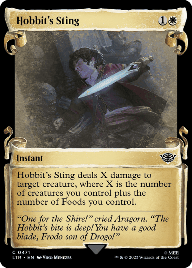 Hobbit's Sting deals X damage to target creature, where X is the number of creatures you control plus the number of Foods you control.