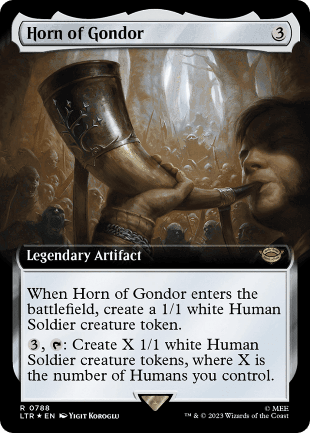 When Horn of Gondor enters, create a 1/1 white Human Soldier creature token. {3}, {T}: Create X 1/1 white Human Soldier creature tokens, where X is the number of Humans you control.