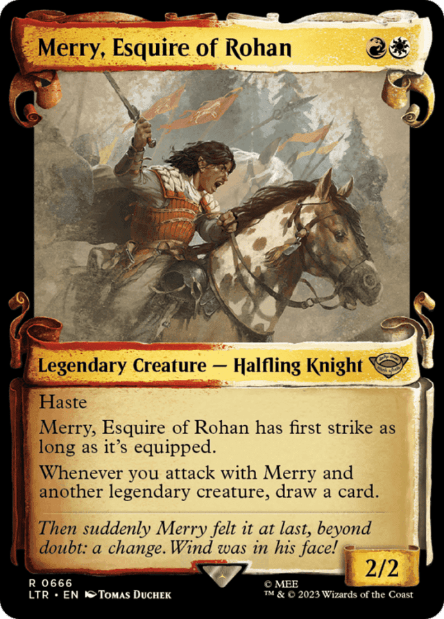 Haste Merry has first strike as long as it's equipped. Whenever you attack with Merry and another legendary creature, draw a card.