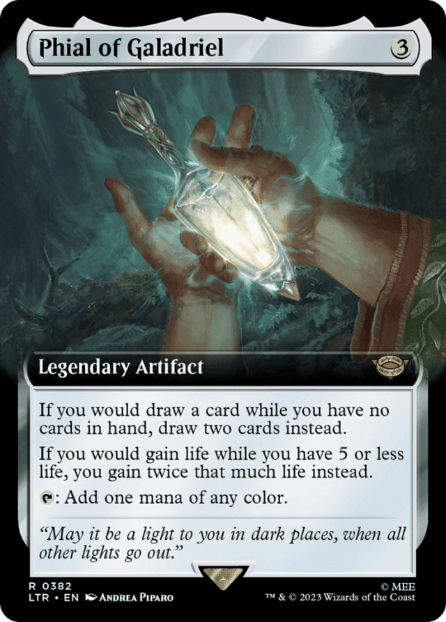 Any time you are instructed to draw more than one card, you draw them one at a time. For example, if you control Phial of Galadriel and have no cards in hand and you're instructed to "draw two cards," your first card draw is replaced by drawing two cards, then you'll draw the second card from the original instruction. In total, you'll draw three cards. — If an effect would set your life total to a specific number that's higher than your current life total, that effect causes you to gain life equal to the difference. If your life total is 5 or less, Phial of Galadriel will then double the amount of life that effect would cause you to gain. For example, if you have 3 life and an effect says that your life total "becomes 10," you would gain 7 life which Phial doubles to 14, so your life total will actually become 17. — If two or more replacement effects would apply to a card-drawing event, the player drawing the card chooses the order in which to apply them. — If you somehow control more than one Phial of Galadriel, each one will effectively add one card. For example, if you control two Phials of Galadriel and would draw a card while you have no cards in hand, the effect of one Phial of Galadriel will replace the event "draw a card" with "draw two cards." The effect of the other Phial of Galadriel will replace the drawing of the first of those two cards with "draw two cards." In total, you would draw three cards. — In a Two-Headed Giant game, life gained by your teammate won't cause Phial of Galadriel's second ability to apply, even though it will cause your team's life total to increase. — The second abilities of multiple Phials of Galadriel are cumulative. If you control two, life gained while you have 5 or less life will be multiplied by 4. Three Phials will multiply that life gain by 8. And so on.