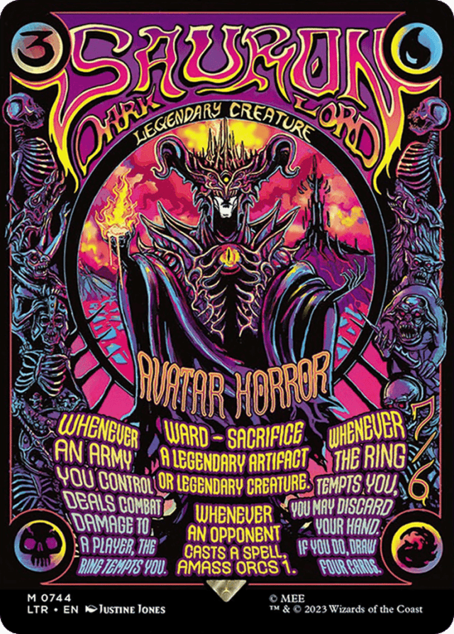 Ward—Sacrifice a legendary artifact or legendary creature. Whenever an opponent casts a spell, amass Orcs 1. Whenever an Army you control deals combat damage to a player, the Ring tempts you. Whenever the Ring tempts you, you may discard your hand. If you do, draw four cards.