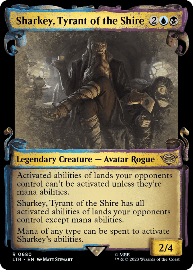 Activated abilities contain a colon. They're generally written "[Cost]: [Effect]." Some keywords are activated abilities; they have colons in their reminder text. — An activated mana ability is one that produces mana as it resolves, not one that costs mana to activate. — If an activated ability of a land an opponent controls references the card it's printed on by name, treat Sharkey, Tyrant of the Shire's version of that ability as though it referenced Sharkey, Tyrant of the Shire by name instead. — Sharkey, Tyrant of the Shire gains only activated abilities, excluding activated mana abilities. It doesn't gain keyword abilities (unless those keyword abilities are activated), triggered abilities, or static abilities. — Sharkey, Tyrant of the Shire's last ability uses a new template indicating that you may spend mana as though it were mana of any type to activate Sharkey, Tyrant of the Shire's abilities. The six types of mana are white, blue, black, red, green, and colorless. — Snow mana is not a type of mana. Sharkey, Tyrant of the Shire's last ability won't let you pay a snow cost using mana produced by a nonsnow source.