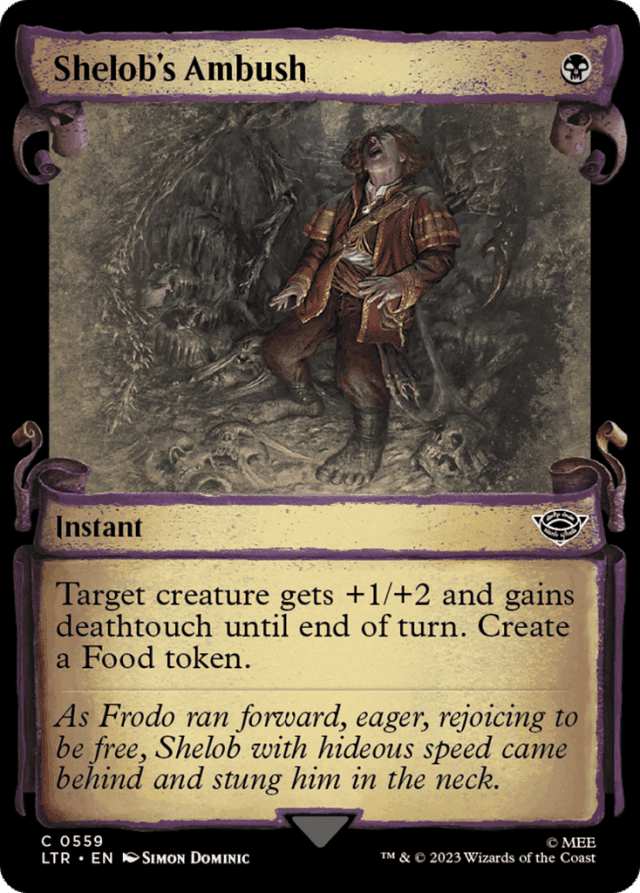 Target creature gets +1/+2 and gains deathtouch until end of turn. Create a Food token. (It's an artifact with "{2}, {T}, Sacrifice this token: You gain 3 life.")
