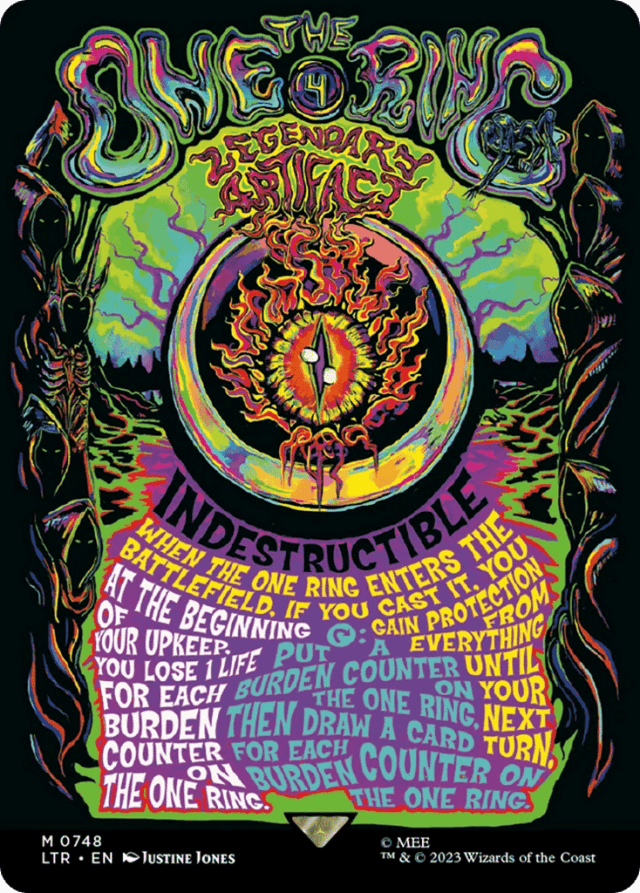 Indestructible When The One Ring enters, if you cast it, you gain protection from everything until your next turn. At the beginning of your upkeep, you lose 1 life for each burden counter on The One Ring. {T}: Put a burden counter on The One Ring, then draw a card for each burden counter on The One Ring.