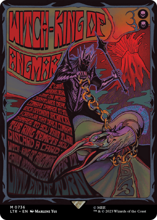 Flying Whenever one or more creatures deal combat damage to you, each opponent sacrifices a creature of their choice that dealt combat damage to you this turn. The Ring tempts you. Discard a card: Witch-king of Angmar gains indestructible until end of turn. Tap it.
